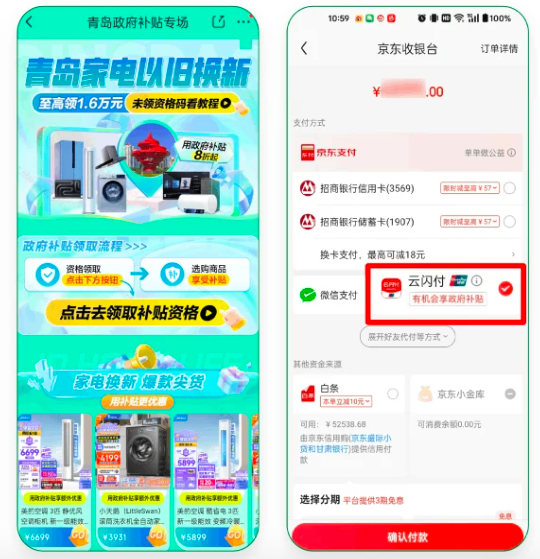 ⑤、支付方式沒按要求選擇。比如天津、青島、陜西這些地區要求在支付時需使用云閃付。如果你下單付款時,選擇了其他支付方式(如支付寶、微信等)就不會彈出政府補貼那一項。這個在各省市補貼領取頁面一般都有說明的!