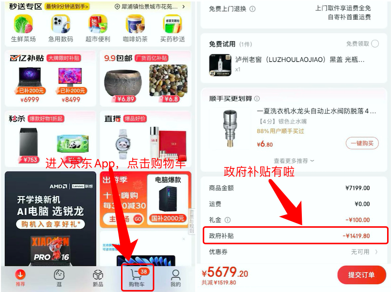 解決方法:你先把想購買的商品加入購物車,然后再打開京東App前往購物車對這件商品進行結算,你會發現這時下單頁面能顯示政府補貼了。